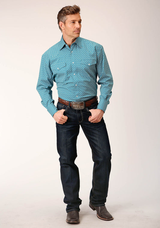 Roper Men's Long Sleeve Snap Diamond Print Turquoise Western Shirt (03-001-0225-6019 BU)