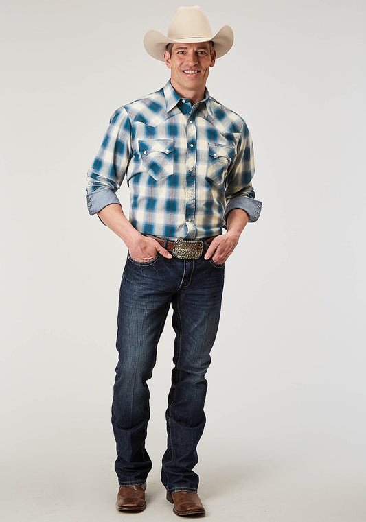 Roper Men's Long Sleeve Snap Arrow Dobby Plaid Western Shirt (03-001-0062-0313 BU)