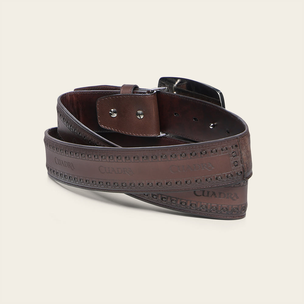 Realza tu estilo western con este lujoso cinturón vaquero para hombre, elaborado artesanalmente en auténtica piel de fuscus y piel de bovino. El cinturón combina artesanía y materiales de primera calidad, con un diseño exclusivo que refleja la excelencia de Cuadra.