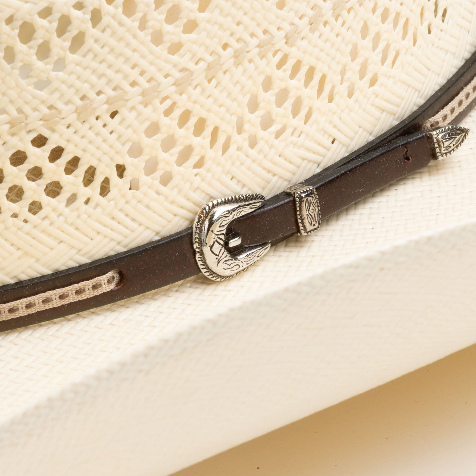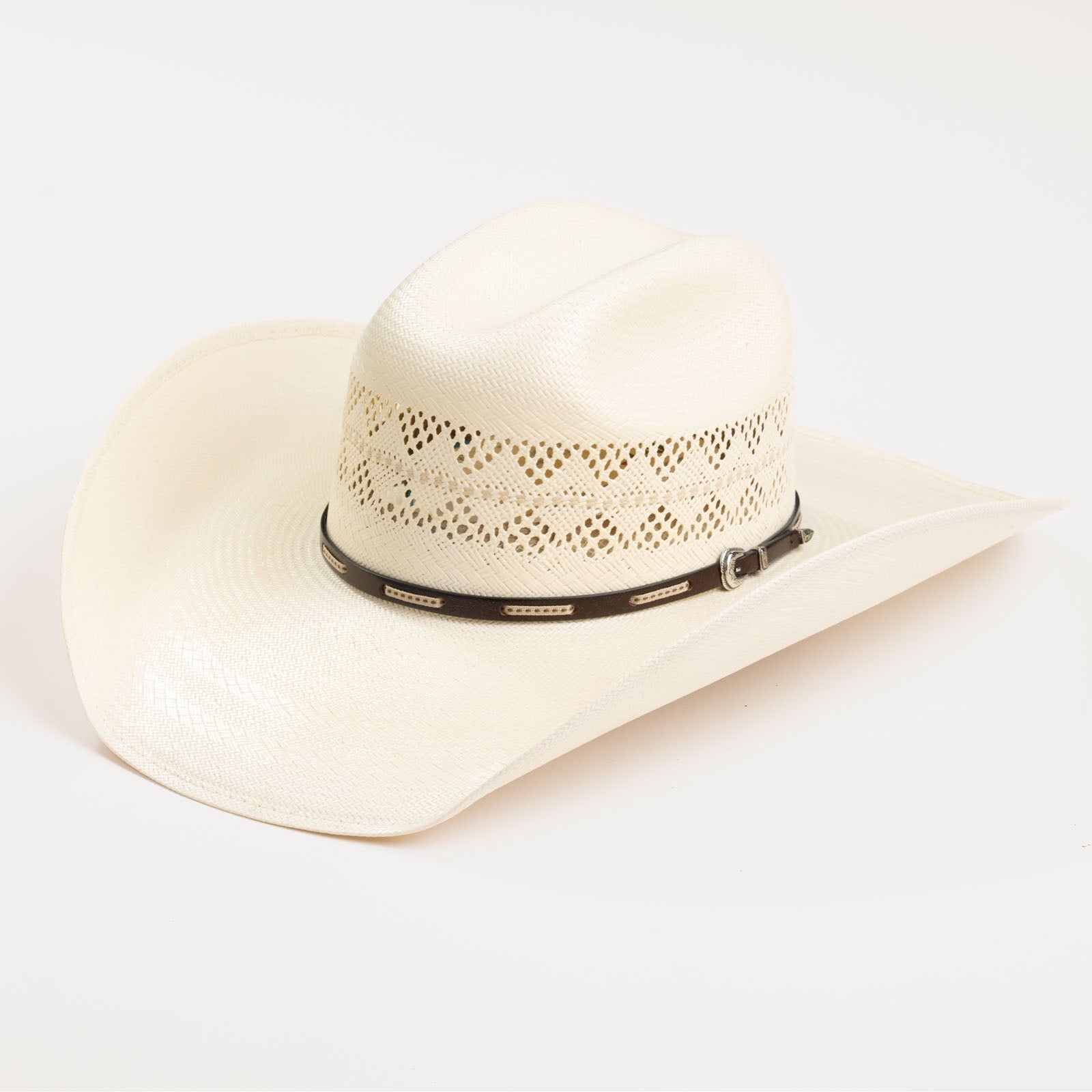 El sombrero vaquero 10X Buckthorn, tejido a mano con paja shantung, cuenta con una banda de sudor Xtreme transpirable y un ala limpia de 4", diseñado para largos días bajo el sol y noches aún más largas bajo las estrellas.