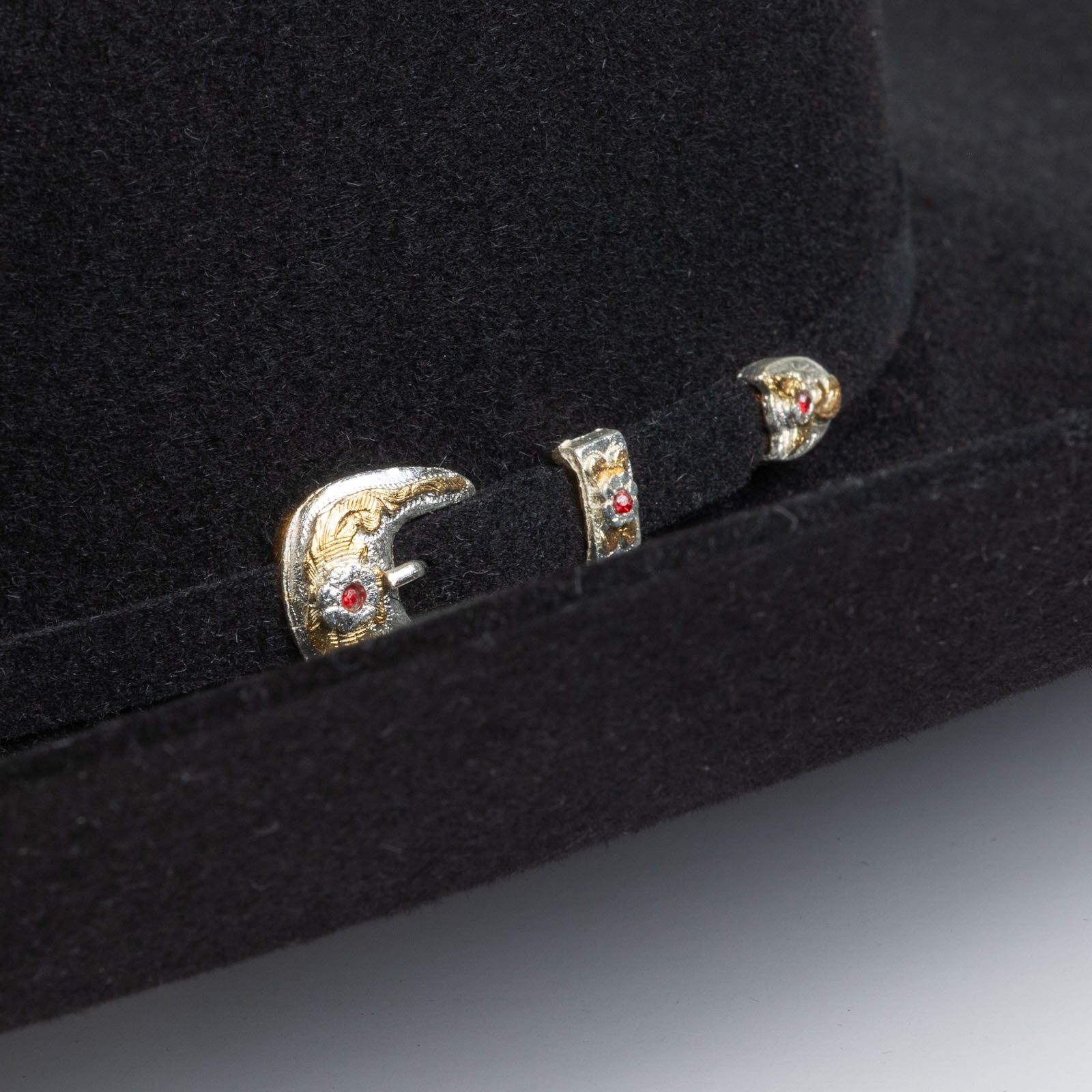 Confeccionado con los mejores materiales, el sombrero vaquero 6X Real de fieltro de pelo de Larry Mahan se distingue por su suave acabado de fieltro y su ajuste perfecto. Adornado con una hebilla de tres piezas y rubíes engastados individualmente, este sombrero de primera calidad es el complemento ideal para tu próxima salida nocturna.