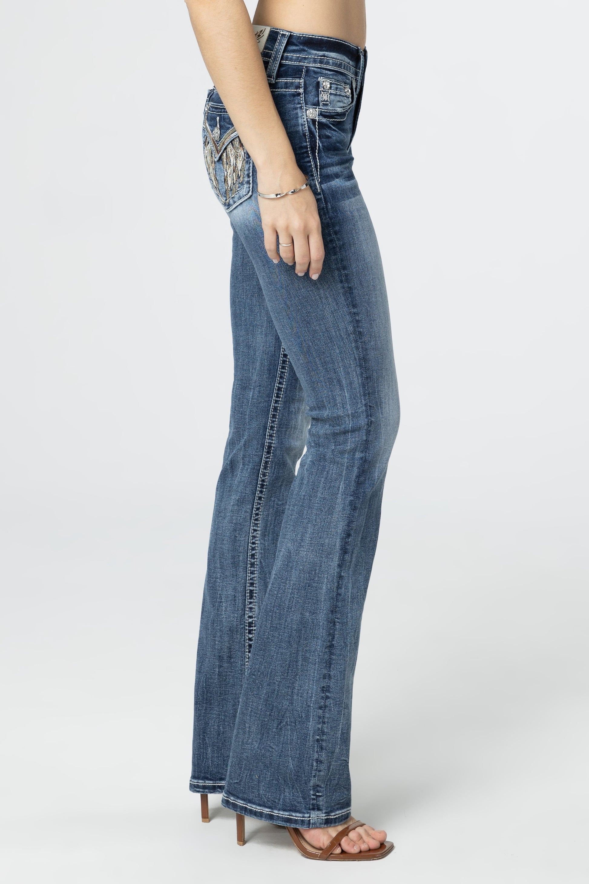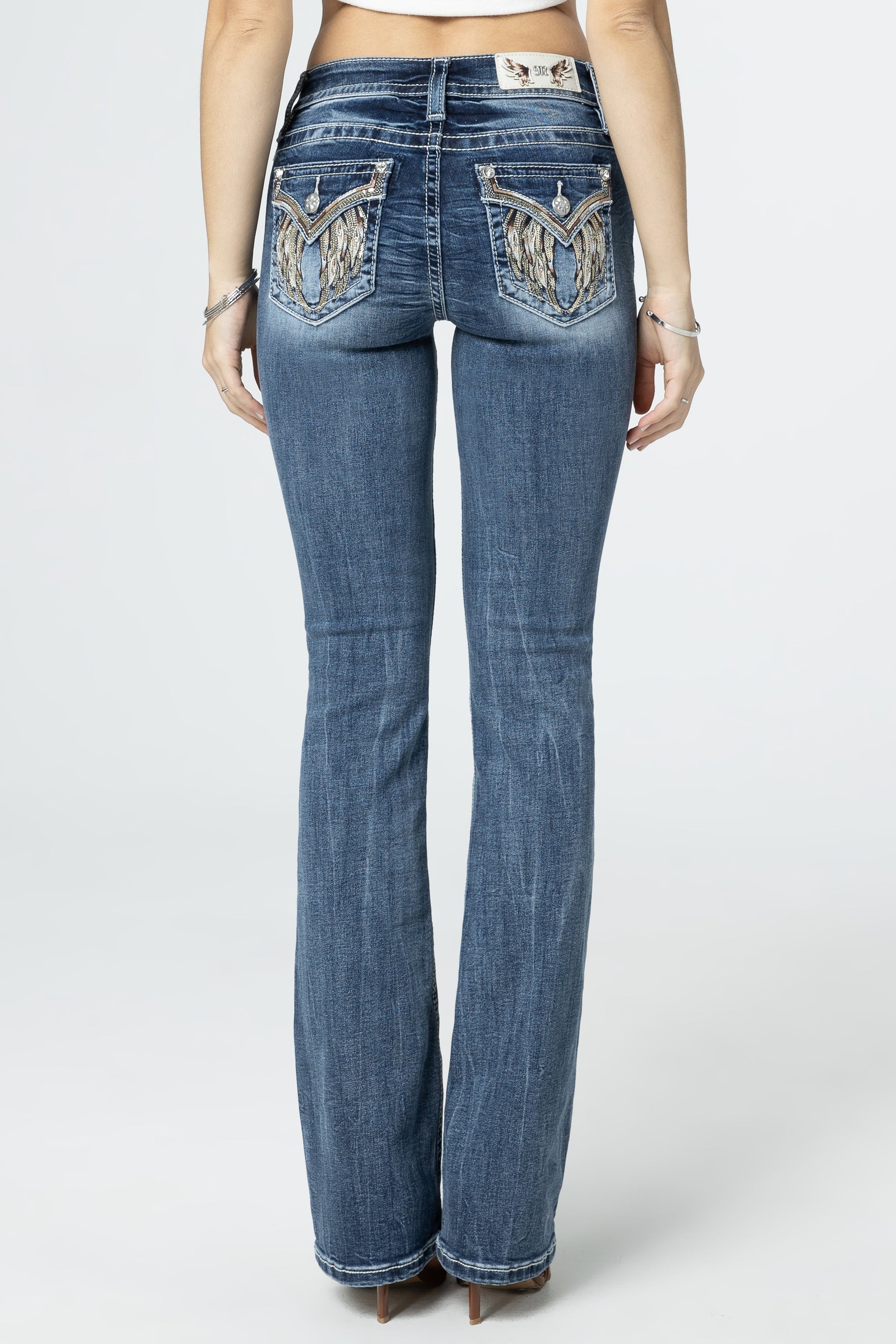 Vaqueros de corte bota Miss Me con alas de plumas naturales para mujer (M5082B143V-K1379 / Lavado medio oscuro)
