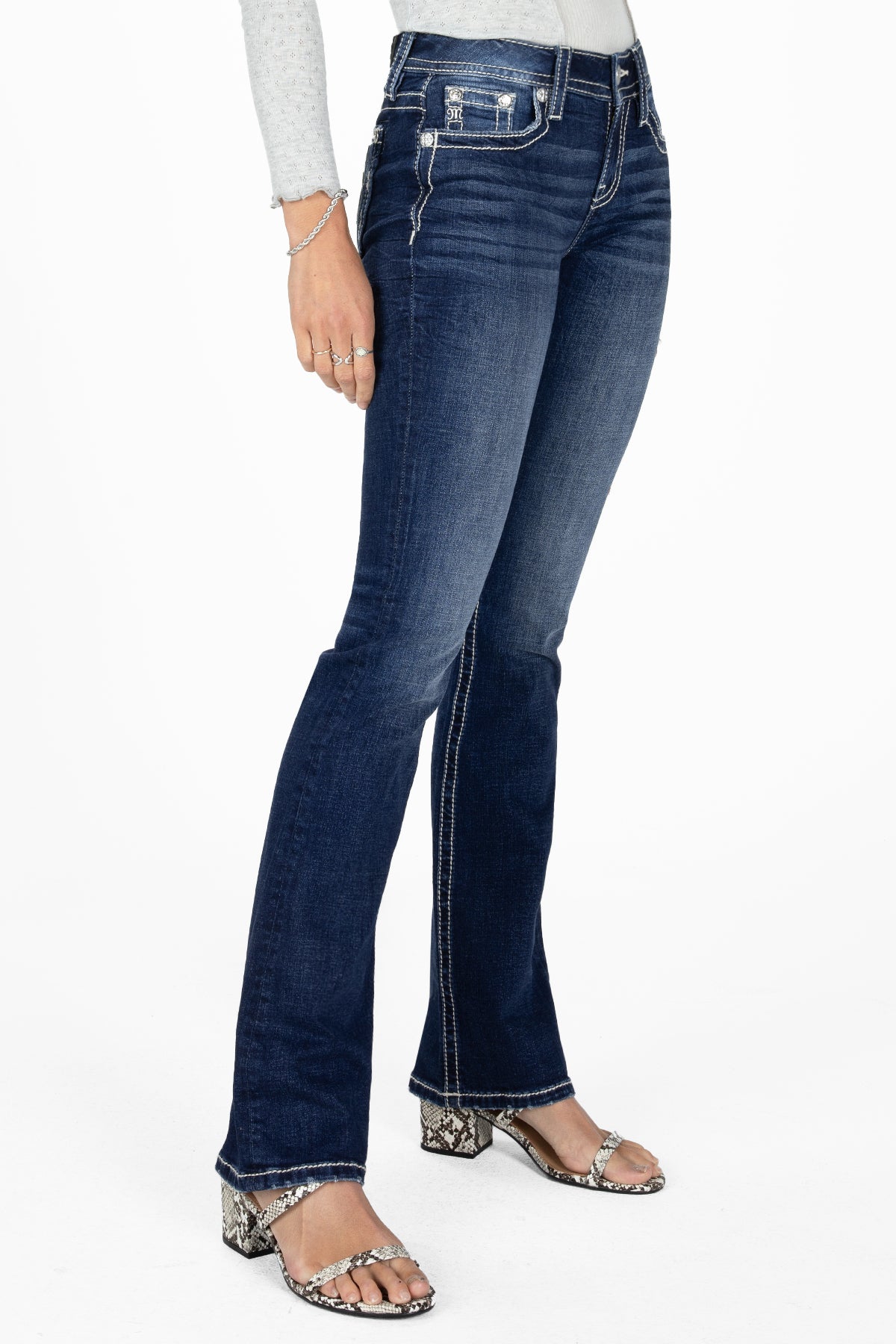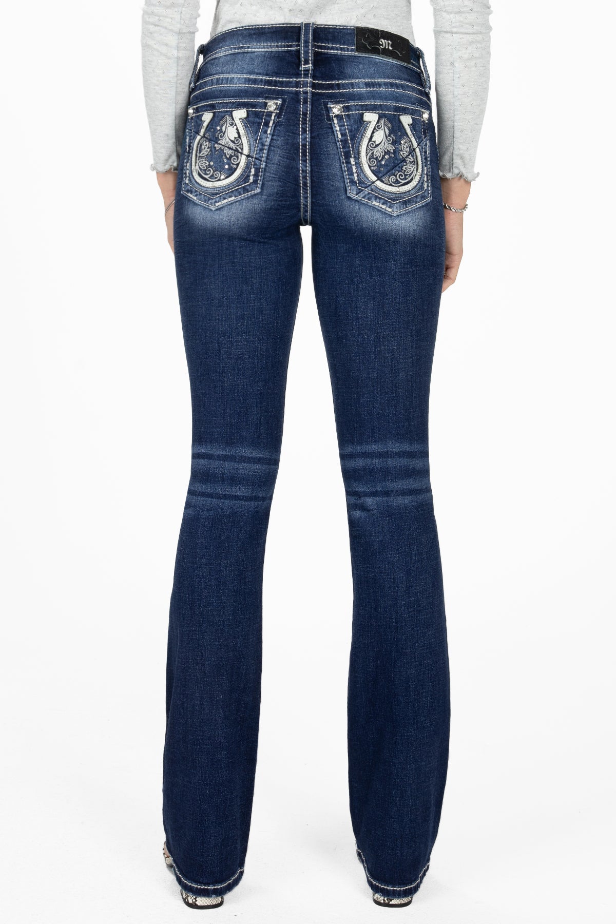 Vaqueros Miss Me con corte abotonado y diseño de herradura con remolinos florales para mujer (M9183B-D1037 / Lavado oscuro)