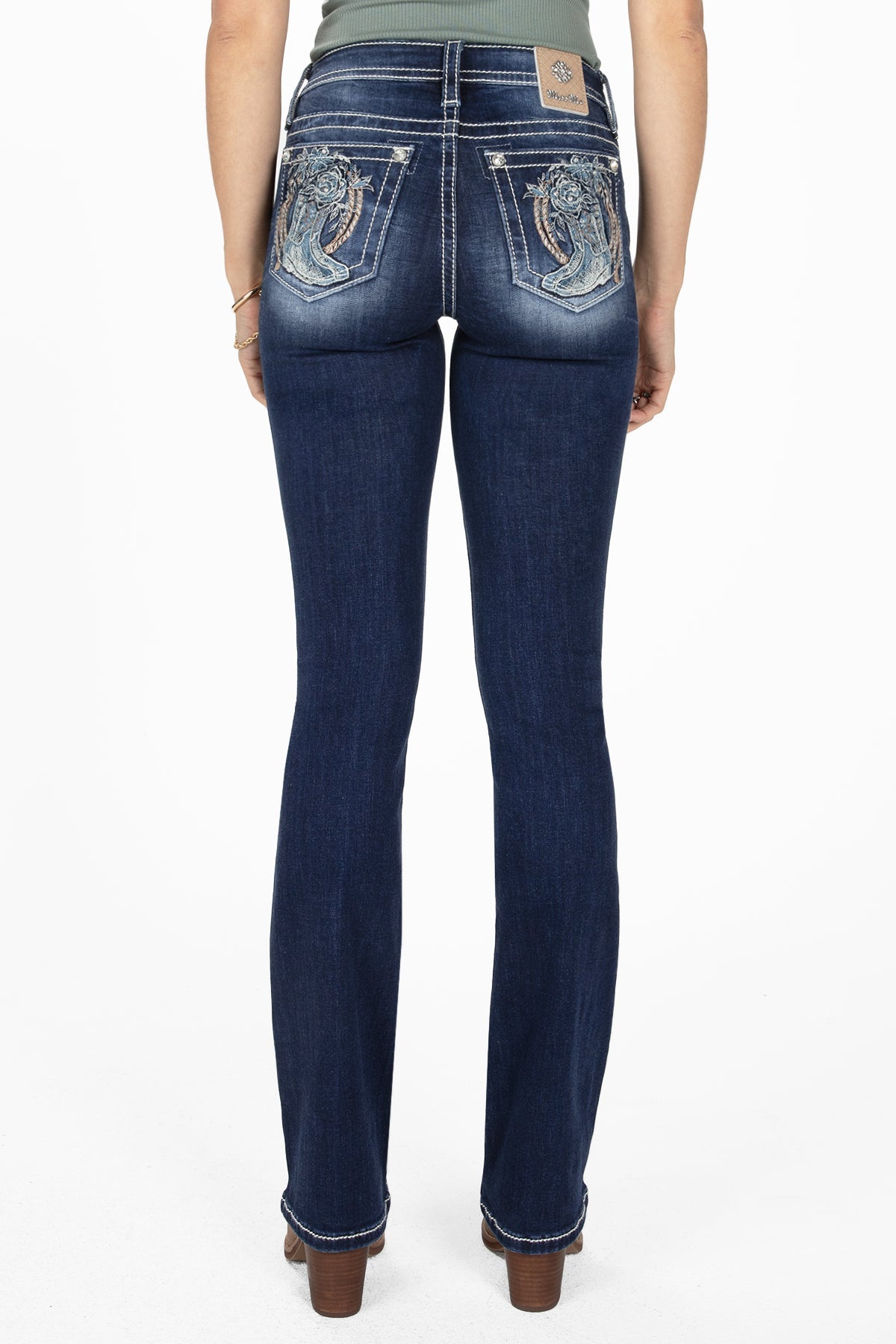 Vaqueros de corte bota Miss Me para mujer con diseño de cuerda y botas (M9196B-D1027 / Lavado oscuro)