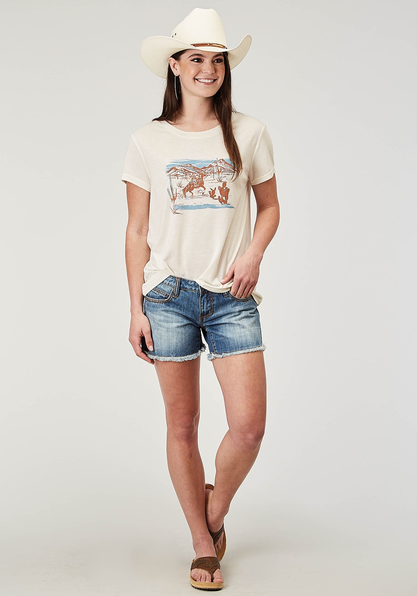 Camiseta Roper de manga corta para mujer, de poliéster y rayón color crema, con decoración serigrafiada (03-039-0513-2020 WH)