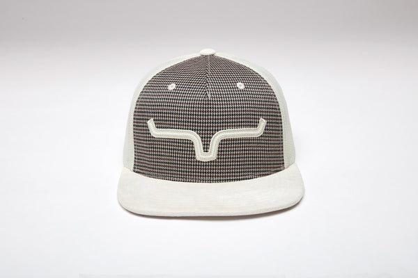 The Holmes Hat brings autumn character to a timeless Western silhouette. Crafted from houndstooth twill, this 5-panel ranch hat combines texture and tradition with a faux suede bill for a warm, seasonal touch. A suede die-cut Kimes Ranch horns patch on the front adds depth and authenticity, completing a look that’s both rugged and refined.