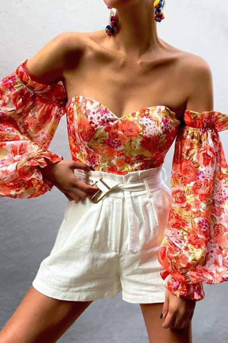 Backless floral top with off-the-shoulder long sleeves.