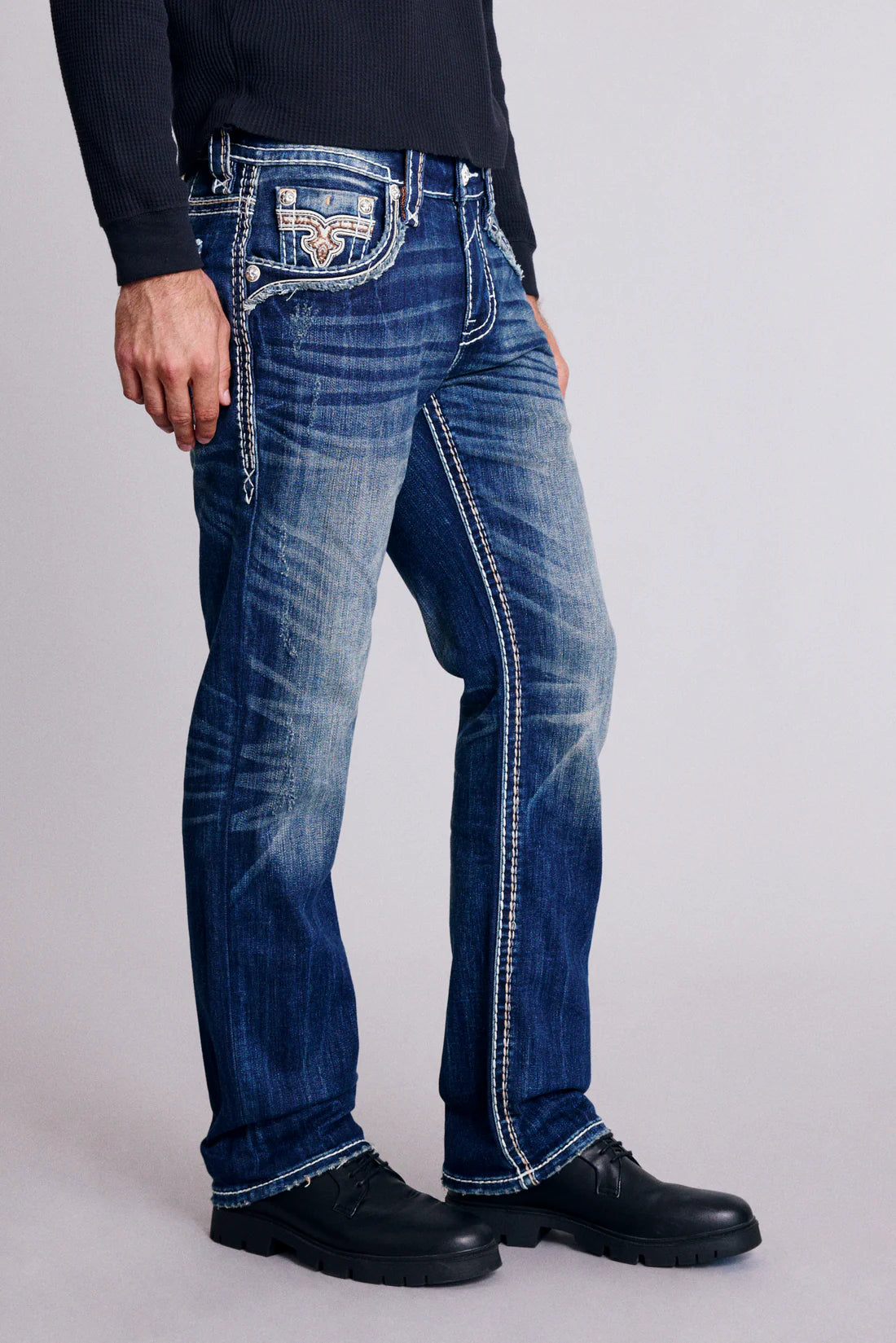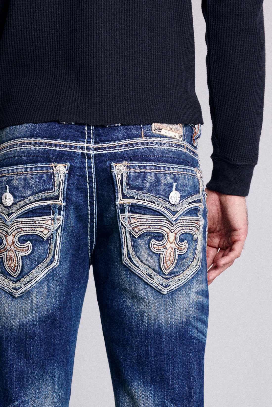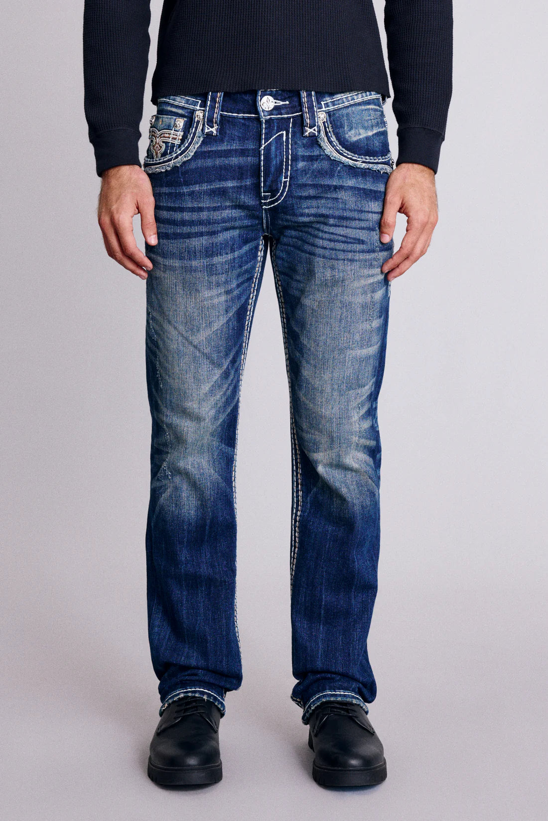 Tristan Denim by Rock Revival, crafted in a dark vintage wash, designed in Los Angeles.