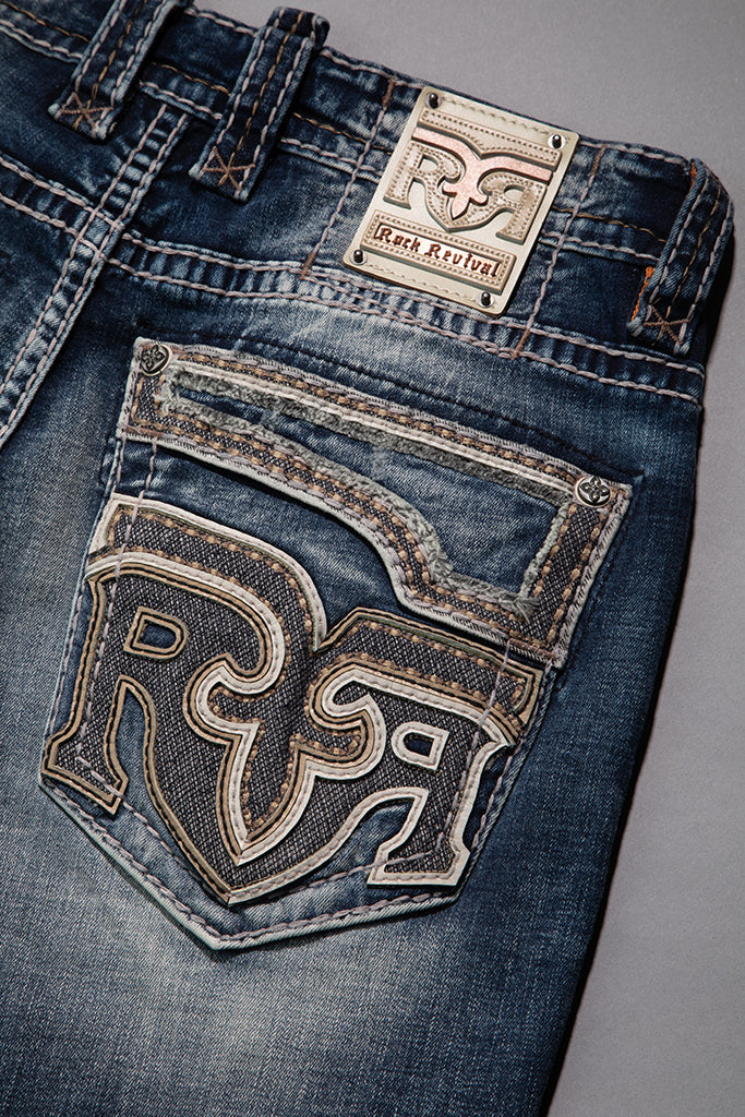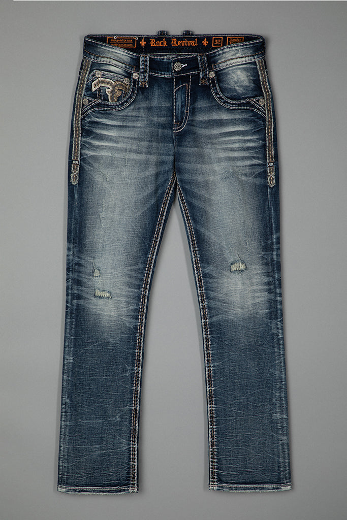 The Xander Straight Jeans redefine men’s premium straight-leg denim with quiet strength. Crafted from premium stretch denim, this classic straight fit delivers versatility and everyday wearability. Subtle distressing and clean stitch detailing add a refined edge, with the iconic inverted Fleur-de-Lis back pockets. Finished with custom pewter buttons and rivets, and a metal-engraved “Rock Revival” leather patch. Built for longevity. A statement. A standard.